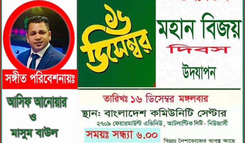 সুব্রত চৌধুরী- আটলান্টিক সিটিতে যথাযোগ্য মর্যাদায় বিজয় দিবস উদ্যাপন করবে বাংলাদেশ অ্যাসোসিয়েশন অব সাউথ জার্সি। এ উপলক্ষে ১৬ ডিসেম্বর, মঙ্গলবার সন্ধ্যা ছয়টায় সিটির ২৭০৯ ,ফেয়ারমাউন্ট…