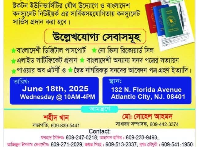 আটলান্টিক সিটিতে ১৮ জুন, বুধবার ভ্রাম্যমাণ কনস্যুলেট সেবা