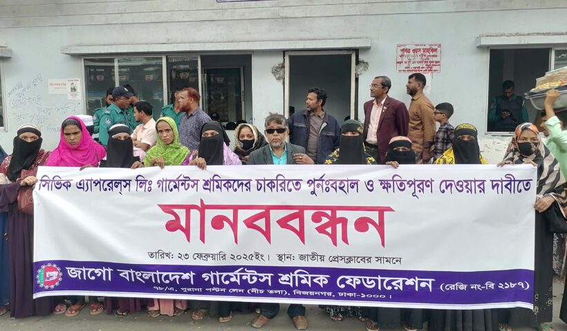 সিভিক এ্যাপারেলস লিঃ গার্মেন্টস শ্রমিকদের চাকুরীতে পুনর্বহাল ওক্ষতিপূরণ দেওয়ার দাবীতে মানববন্ধন অনুষ্ঠিত