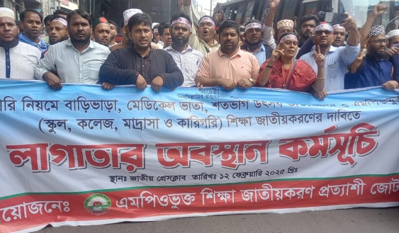 হ-বাংলা নিউজ: এমপিওভুক্ত শিক্ষা প্রতিষ্ঠানে পূর্ণদিবস কর্মবিরতি পালিত, প্রেসক্লাবে শিক্ষক সমাবেশ অনুষ্ঠিত এবং শিক্ষা ভবন অভিমুখে পদযাত্রা পুলিশের বাধায় পণ্ড আগামী শুক্র ও শনিবার প্রতিকী অনশন এমপিওভুক্ত শিক্ষায় বৈষম্য নিরসনসহ জাতীয়করণের দাবিতে জাতীয় প্রেসক্লাবের সামনে এমপিওভুক্ত শিক্ষক-কর্মচারীদের লাগাতার অবস্থান কর্মসূচির ৯ম দিনে দেশের বিভিন্ন শিক্ষা প্রতিষ্ঠান থেকে হাজার হাজার শিক্ষক-কর্মচারী অংশগ্রহণ করেন। শিক্ষক-কর্মচারীগণ সরকারি নিয়মে বাড়িভাড়া, চিকিৎসা ভাতা, শতভাগ উৎসব ভাতা ও সর্বজনীন (প্রতিষ্ঠান প্রধান থেকে কর্মচারী পর্যন্ত) বদলীর দাবি জানান। জোটের সদস্য সচিব ও বাংলাদেশ মাদ্রাসা শিক্ষক-কর্মচারী ফোরাম এর সভাপতি প্রিন্সিপাল দেলাওয়ার হোসেন আজীজী বলেন, মাননীয় শিক্ষা উপদেষ্টা আমাদের ভাতাসমূহ পরিবর্তনের মৌখিক আশ্বাস দিয়েছেন। কিন্তু এমপিওভুক্ত শিক্ষক-কর্মচারিগণ বারবার প্রতারিত হয়ে আশ্বাসের উপর বিশ্বাস করে আবারও প্রতারিত হতে চায় না। সরকারে আহ্বানে সাড়া দিয়ে ১৭ ফেব্রুয়ারি এমপিওভুক্ত শিক্ষা জাতীয়করণ প্রত্যাশী জোটের ৬ সদস্যের প্রতিনিধি দল শিক্ষা মন্ত্রণালয়ের অতিরিক্ত সচিব মোঃ হুমায়ুন কবিরের সাথে বৈকঠ করেন। নেতৃবৃন্দ অবিলম্বে শতভাগ উৎসব ভাতার প্রজ্ঞাপন জারির জোর দাবি জানান। বাড়িভাড়া এবং মেডিকেল ভাতা বৃদ্ধির সুস্পষ্ট ঘোষণা দাবি করেন।এসময় সচিব বিষয়টি নিয়ে কর্তৃপক্ষের সাথে আলোচনা করে সিদ্ধান্ত পরে জানানোর কথা বলেন। কিন্তু এখন পর্যন্ত সরকারের পক্ষ থেকে কোনো সিদ্ধান্ত জানানো হয়নি। শতভাগ উৎসবভাতার প্রজ্ঞাপন জারি এবং বাড়িভাড়া ও চিকিৎসা ভাতা বৃদ্ধির ব্যাপারে আজ এমপিওভুক্ত শিক্ষা প্রতিষ্ঠানসমূহে ৩য় দিনের মতো পূর্ণ দিবস কর্মবিরতি পালিত হয়ে এমপিওভুক্ত শিক্ষাব্যবস্থা স্থবির হয়ে পড়েছে। মার্চ টু যমুনা কর্মসূচিতে বাধা দেয়ার প্রতিবাদে আজ জাতীয় প্রেসক্লাবে শিক্ষক সমাবেশ অনুষ্ঠিত হয়। সমাবেশে দেশের বিভিন্ন প্রান্ত খেকে হাজার হাজার শিক্ষক অংশগ্রহণ করেন। সমাবেশ শেষে পূর্বনির্ধারিত একটি মিছিল শিক্ষা ভবন অভিমুখে যাত্রা শুর করলে পুলিশি বাধার মুখে পড়ে। পরে পুলিশ জোটের ৮ সদস্যের প্রতিনিধি দলকে আলোচনার জন্য সচিবালয়ে নিয়ে যায়। পরে পুলিশের লোকজন জানায় যে, শিক্ষা উপদেষ্টা ও উর্ধতন কোন কর্মকর্তা অফিসে নেই। আমরা পুলিশের এমন প্রতারণামূলক আচরণের তীব্র নিন্দা জানাই। আগামী শুক্রবার ও শনিবার প্রতীকি অনশন অনুষ্ঠিত হবে। উল্লেখ্য যে, এমপিওভুক্ত শিক্ষক-কর্মচারিগণ মাসিক ১০০০/- বাড়িভাড়া, ৫০০/- চিকিৎসা ভাতা ও ২৫% উৎসব ভাতা পেয়ে থাকেন যা অত্যন্ত অযৌক্তিক ও অমানবিক। ২৫% উৎসব ভাতা হিসেবে একজন এন্
