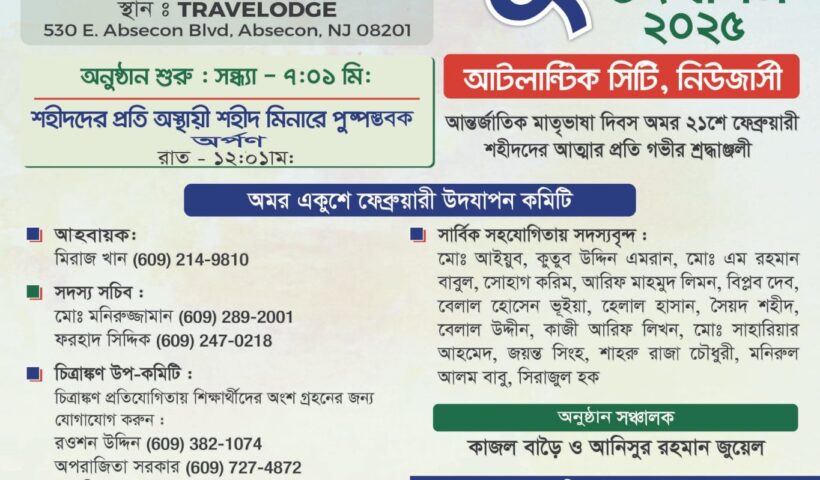 সুব্রত চৌধুরী- নিউজার্সি রাজ্যের আটলান্টিক সিটিতে আন্তর্জাতিক মাতৃভাষা দিবস ও মহান একুশে উদ্যাপন উপলক্ষে ব্যাপক প্রস্তুতি চলছে। একুশের প্রথম প্রহরে এবসিকন শহরের ৫৩০ পূর্ব এবসিকন বুলেভার্ডে অবস্থিত ট্রাভেল লজ…