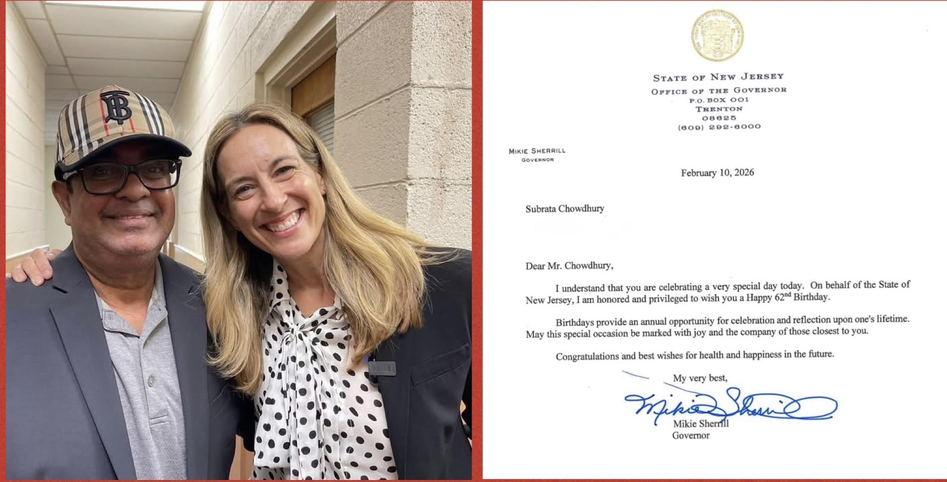 ১০ ফেব্রয়ারি, মঙ্গলবার নিউজার্সি রাজ্যের আটলান্টিক সিটি নিবাসী লেখক-সাংবাদিক সুব্রত চৌধুরীর বাষট্টিতম জন্মদিন।তাঁর জন্মদিনে তিনি নিউ জারসি রাজ্যের গভর্নর মাইকি শেরিলের ভালোবাসা ও শুভেচ্ছায় সিক্ত হয়েছেন।