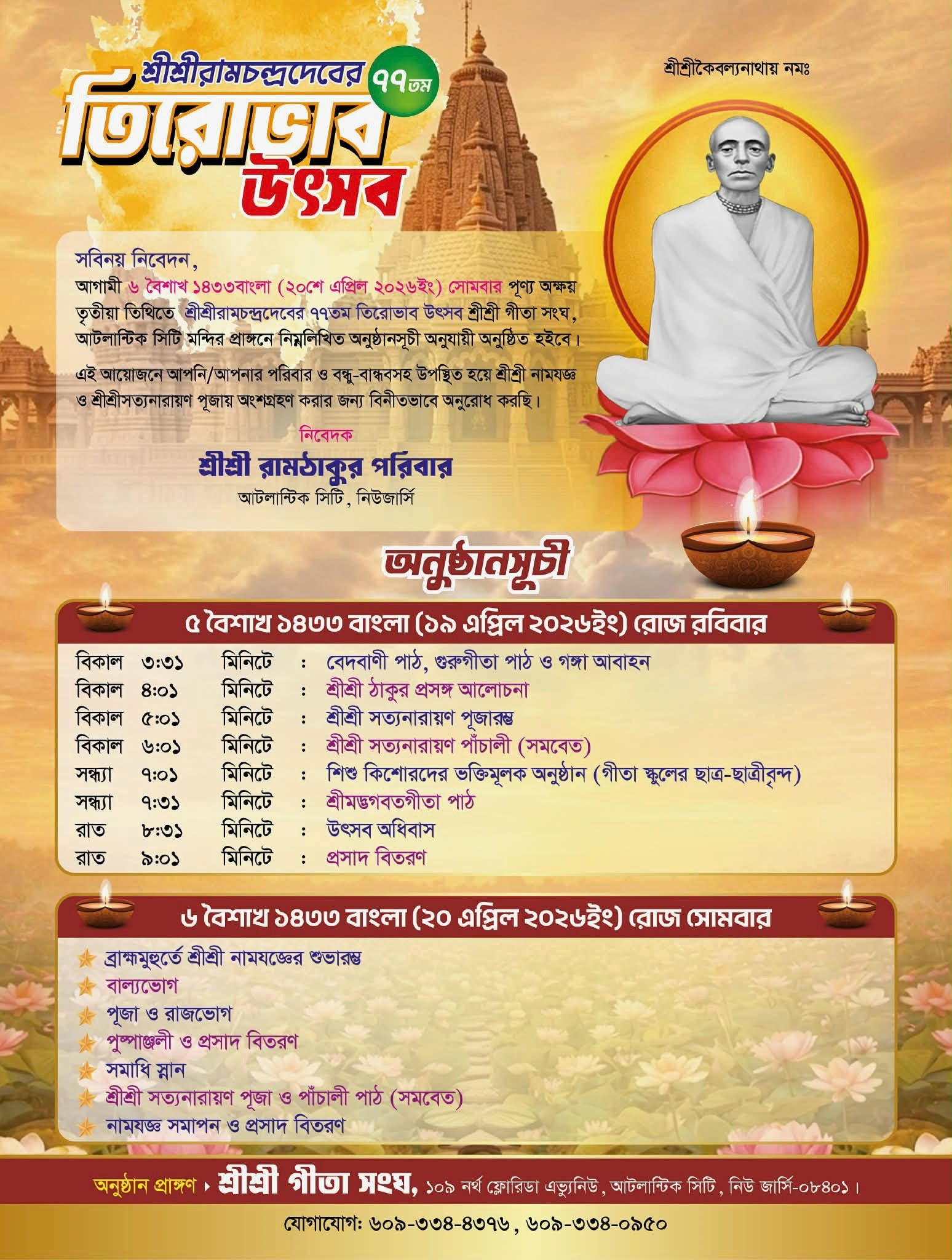 আটলান্টিক সিটিতে ষষ্ঠবারের মতো অনুষ্ঠিতব্য শ্রী শ্রী রামঠাকুর তিরোভাব উৎসবের আয়োজন উপলক্ষে সনাতন ধর্মাবলম্বীদের মাঝে সাজ সাজ রব পড়েছে ।