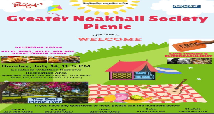 হলিউড বাংলা নিউজঃ আগামী ১৪ জুলাই, রবিবার গ্রেটার নোয়খালী সোসাইটির পক্ষ থেকে পিকনিক এর আয়োজন করা হয়েছে অনুষ্ঠানটি শুরু হবে সকাল ১১টা থেকে এবং শেষ হবে ৫টায় উক্ত অনুষ্ঠানে ১২ থেকে ৩ টা পর্যন্ত চলবে হালাল টাকো এবং হট ডগ এর পর চলবে বাংলা খাবার। উক্ত পিকনিক এ উপস্থিত থাকবেন বাংলদেশ এর গুণী শিল্পী বৃশিস্ট গায়ক প্রতীক হাসান আরো উপস্থিত থাকবেন কৌতুক অভিনেতা জামিল থাকবেন লামীমা,বন্যা ও নীল। বাচ্চাদের জন্য আছে এন্টারটেইনমেন্ট এন্ড কিডস বাউন্স হাউস আপনারা সবাই এই অনুষ্ঠান এ আমন্ত্রিত। অনুষ্ঠানটির স্থান হলো Whittier Narrows Recreation Area (Meadows North Lake Parking lot, 751 S Santa Anita Ave, South El Monte, CA 91733)