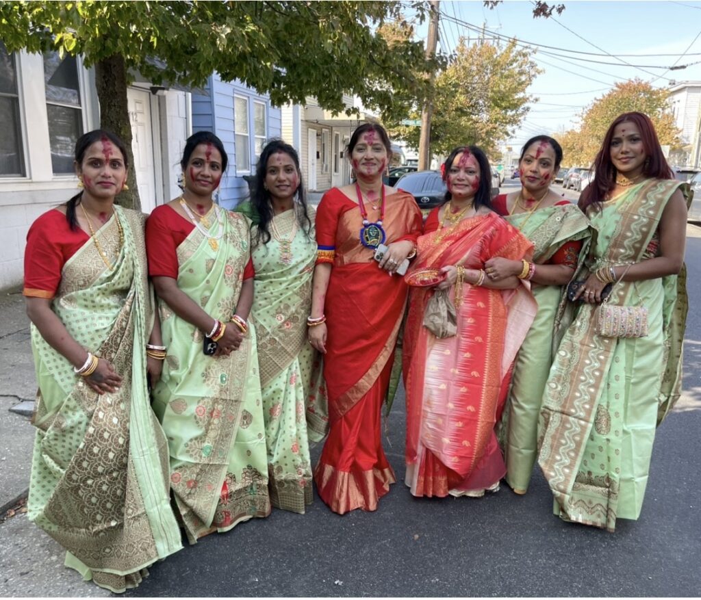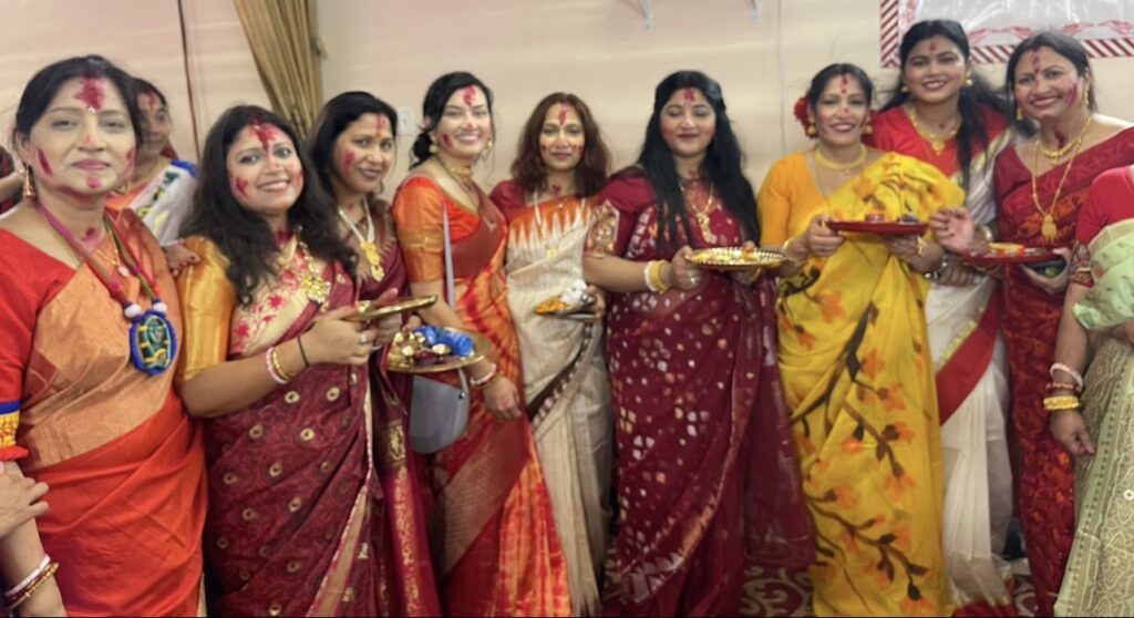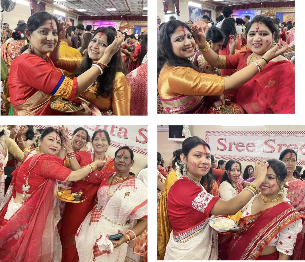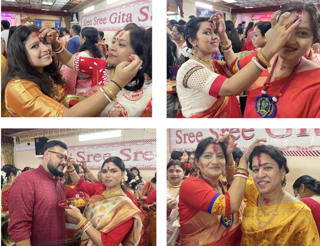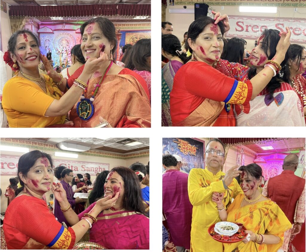 সেই ক্ষেত্রে তাঁরা একে অন্যের সিঁথি, হাতের শাঁখা ও মুখাবয়ব সিঁদুর দিয়ে রাঙিয়ে দেন। বিবাহিত নারীরা একে অন্যের সৌভাগ্য কামনা করে এই সিঁদুর পরিয়ে থাকে। এই সিঁদুর খেলার মাধ্যমে বিজয়ার ভারাক্রান্ত হৃদয়ে কিছুটা আনন্দের সঞ্চার হয়। বিবাহিত নারীরা ব্যতীত এটি অবিবাহিত মেয়েরাও খেলে থাকেন। অবিবাহিত নারীদের বিবাহিত নারীরা এ জন্যই সিঁদুর পরিয়ে দেন, যাতে দুর্গা মায়ের আশীর্বাদে তাদের ভবিষ্যৎ বিবাহিত জীবন সুখ সমৃদ্ধিতে ভরে ওঠে। এই দিনে প্রায় সব নারীই লাল রংয়ের শাড়ি পরে থাকেন।গত ১২ অক্টোবর, শনিবার শ্রী শ্রী গীতা সংঘের দুর্গোৎসবের শেষ দিন সিঁদুর খেলায় মেতেছিল নিউ জার্সি রাজ্যের আটলান্টিক সিটির প্রবাসী হিন্দু নারীরা। দেবী দুর্গার বিদায়ের আগে এদিন সকালে মন্দিরে চলে সিঁদুর খেলা। সকালে পূজা অর্চনার পর দেয়া হয় পুষ্পাঞ্জলি। এরপরই হিন্দু বিবাহিত নারীরা দেবীর পায়ে লাল টকটকে সিঁদুর নিবেদন করেন। পরে সেই সিঁদুর একে অপরকে লাগিয়ে আগামী দিনের জন্য শুভ কামনা করেন। সেই সঙ্গে স্বামী সন্তানের মঙ্গল কামনা করেন।শ্রী শ্রী গীতা সংঘের সভাপতি প্রসেনজিৎ দত্ত ও সাধারন সম্পাদক স্বরূপ দাশ ভক্তবৃন্দদের বিজয়া দশমীর শুভেচছা জানান।