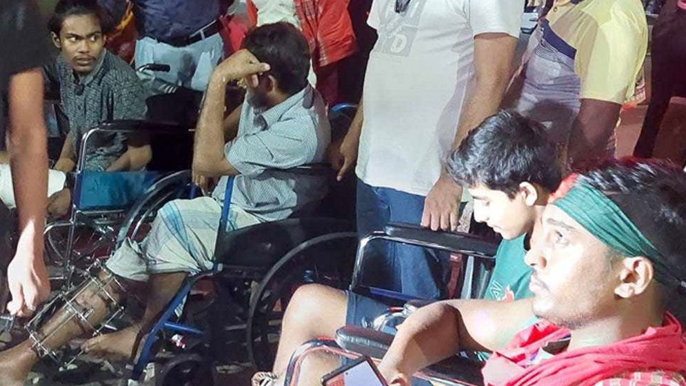 আন্দোলনকারী আহতরা, অনেকেই হুইল চেয়ারে বা ভাঙা পা নিয়ে, chairs নিয়ে রাস্তার মাঝে বসে আছেন। তাদের দাবি—যতক্ষণ না উপদেষ্টারা এসে তাদের সঙ্গে কথা বলছেন, তারা রাস্তা ছাড়বেন না এবং হাসপাতালে ফিরে যাবেন না।