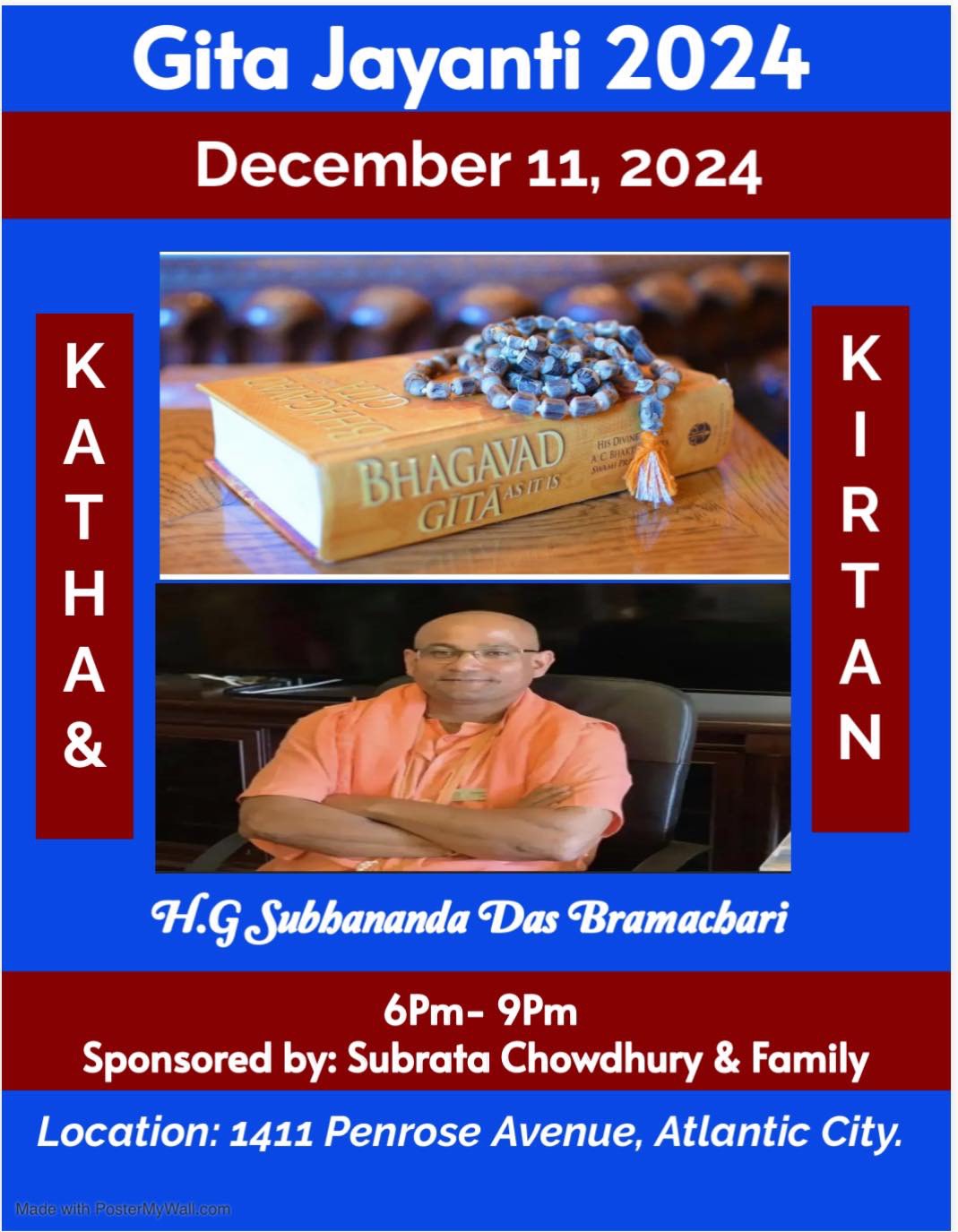 আগামী ১১ ডিসেম্বর, বুধবার গীতা জয়ন্তী।নিউ জারসি রাজ্যের আটলান্টিক সিটিতে গীতা জয়ন্তীতে ভক্তরা সারাদিনব্যাপী শ্রীকৃষ্ণর আরাধনা করবেন, তুলসী মালা জপবেন, সঙ্গে পাঠ করবেন হিন্দুদের পবিত্র ধর্মগ্রন্থ ভাগবত গীতা। এছাড়া কৃষ্ণভক্তদের অনেকেই গীতা জয়ন্তী উপলক্ষে গীতা দান করবেন।