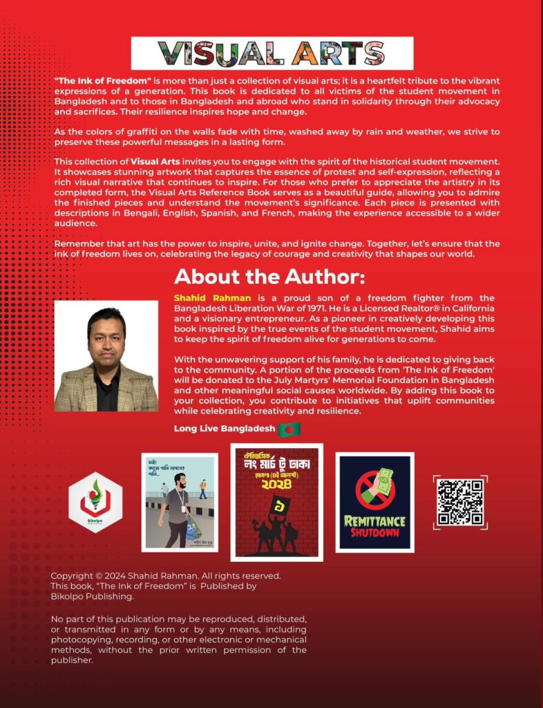 জুলাই অভ্যুত্থানের গ্রাফিতি সংরক্ষণে নিজস্ব রিসোর্স ব্যবহার করে, মুল্যবান সময় ক্ষেপণ করে, আর্থিক বিনিয়োগ করে দেশের বিভিন্ন স্থান থেকে এগুলি সংগ্রহ করে সংকলন করেছেন “ THE INK OF FREEDOM” নামের একটি বই।(বইটির দুটি ভার্সন রয়েছে ১)গ্রাতিফি ২) কালির ছোয়াতে শিল্পীর অংকিত ছবি) যাতে জুলাই গণঅভ্যুত্থানের পূর্বাপর ঘটে যাওয়া গুরুত্বপূর্ণ সব ঘটনা প্রবাহের উল্লেখযোগ্য সব ছবিগুলি সংগৃহীত হয়েছে। বইটি বর্তমানে আমেরিকা, ইংল্যান্ড, কানাডা, জার্মানি, ফ্রান্স অস্ট্রেলিয়া সহ বিশ্বের ১৩টি দেশে পাওয়া যাচ্ছে এবং বইটির ধারাবাহিক বর্ণনায় বাংলা, ইংলিশ, স্প্যানিশ, ফ্র্যাঞ্চ ভাষা ব্যবহিৃত হয়েছে। বইটির স্বত্বাধিকারী জনাব শাহিদ রহমান আমাদের জানিয়েছেন, বইটির বিক্রিত অর্থের একটি অংশ জুলাই শহীদ স্মৃ্তি ফাউন্ডেশনে অনুদান হিসেবে দেওয়া হবে। উল্লেখ্য, জনাব শাহিদ রহমান একজন বীর মুক্তি যোদ্ধার সন্তান এবং জুলাই গণ অভ্যুত্থানের অস্থির সময়ের একজন অনলাইন যোদ্ধাও বটে। তিনি দীর্ঘদিন যাবৎ আমেরিকার ক্যালিফের্নিয়া রাজ্যে বসবাস করে আসছেন। দুই সন্তানের জনক জনাব শাহিদ রহমান পেশায় একজন রিয়েল্টর এবং সফল উদ্যোগতা। দেশ মাতৃকার প্রেমের টানে যারা দেশের কথা চিন্তা করেন, ভবিষ্যৎ প্রজন্মকে যারা বাংলাদেশের গৌরবের গল্প শোনাতে বা দেখাতে চান তারা অবশ্যই THE INK OF FREEDOM বইটি তাদের সংগ্রহে রাখতে অনুরোধ জানিয়েছন জনাব শাহিদ রহমান।