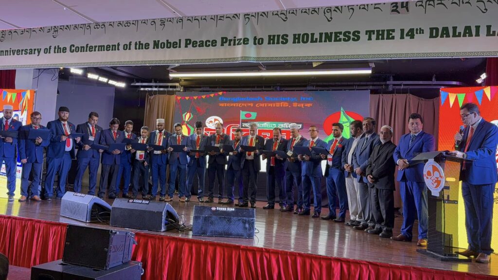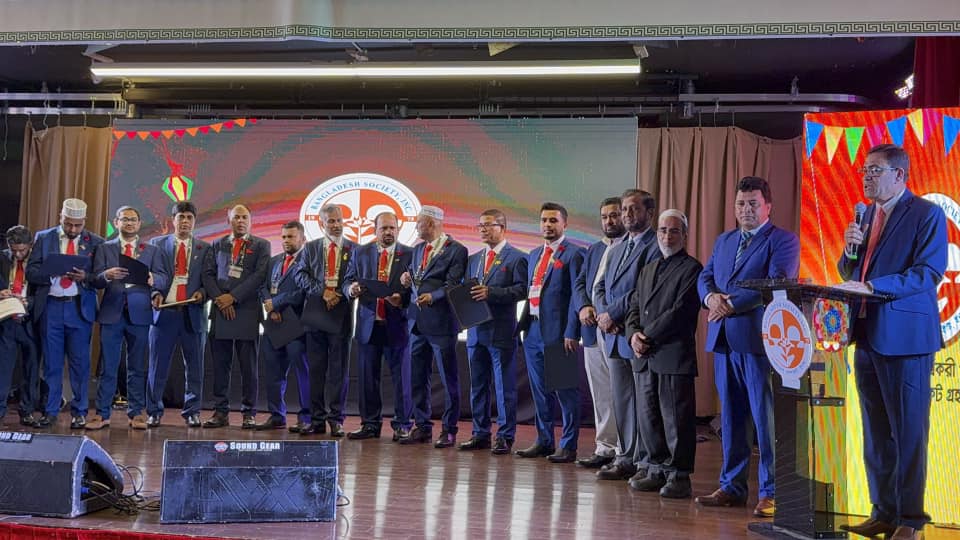 নিউইয়র্ক (ইউএনএ): বাংলাদেশের মহান বিজয় দিবসে বর্ণাঢ্য আয়োজনে ফুলেল শুভেচ্ছায় অভিষিক্ত হলেন যুক্তরাষ্ট্র প্রবাসী বাংলাদেশীদের ‘আমব্রেলা সংগঠন’ হিসেবে পরিচিত বাংলাদেশ সোসাইটি ইনক’র নব নির্বাচিত কমিটির কর্মকর্তারা। সেই সাথে সোসাইটি পালন করে বাংলাদেশের ৫৪তম বিজয় দিবস। এ উপলক্ষ্যে গত ১৬ ডিসেম্বর সোমবার সন্ধ্যায় উডসাইডের তিব্বত কমিউনিটি সেন্টারে মনোজ অনুষ্ঠানের আয়োজন করা হয়। ঠান্ডা আর হালকা বৃষ্টি-বাদলার মধ্যেও অনুষ্ঠানে প্রবাসে বসবাসকারী বীর মুক্তিযোদ্ধারা ছাড়াও সর্বস্তরের হাজারো প্রবাসী বাংলাদেশী সপরিবারে অংশ নেন। ফলে অনুষ্ঠানটি বাংলাদেশীদের মিলন মেলায় পরিণত হয়। অনুষ্ঠানে প্রধান অতিথি ছিলেন নিউইয়র্ক সিটি মেয়র এরিক অ্যাডামস। খবর ইউএনএ’র।