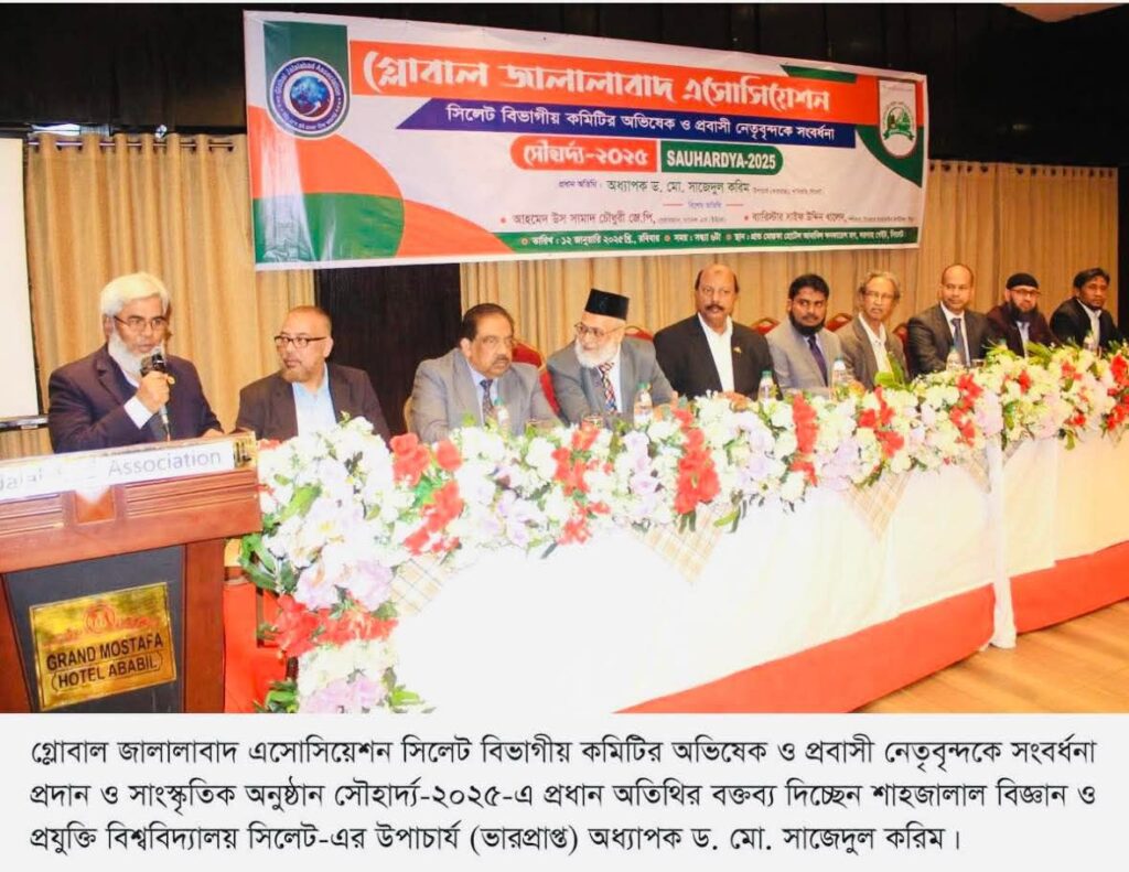 .অধ্যাপক ড. মো. সাজেদুল করিম।শাহজালাল বিজ্ঞান ও প্রযুক্তি বিশ্ববিদ্যালয়-এর উপাচার্য (ভারপ্রাপ্ত) অধ্যাপক ড. মো. সাজেদুল করিম বলেছেন, প্রবাসীরা আমাদের সম্পদ। তারা ভবিষ্যতে মা, মাটির টানে দেশে আসবেন। গ্লোবাল জালালাবাদ এসোসিয়েশনের একটি শক্তিশালী অবস্থান আছে। এ অবস্থানকে কাজে লাগিয়ে দেশের জন্য ভালো গবেষক, পরিকল্পনাবিদ, ব্যবসায়ী এবং প্রকৌশলী তৈরি করা উচিত। এছাড়া এ সংগঠনের মাধ্যমে অসহায় ও সুবিধাবঞ্চিত মানুষ ও বয়স্কদের পুনর্বাসনের পরিকল্পনা নেওয়া দরকার। আমি আশা রাখি, এ অঞ্চলের মানুষের চাহিদা সামনে রেখে গ্লোবাল জালালাবাদ এসোসিয়েশন সিলেট কমিটি কাজ করবে। গ্লোবাল জালালাবাদ এসোসিয়েশন সিলেট বিভাগীয় কমিটির অভিষেক ও প্রবাসী নেতৃবৃন্দকে সংবর্ধনা প্রদান ও সাংস্কৃতিক অনুষ্ঠান সৌহার্দ্য-২০২৫-এ প্রধান অতিথির বক্তব্যে তিনি একথা বলেন। খবর বাপসনিউজ।