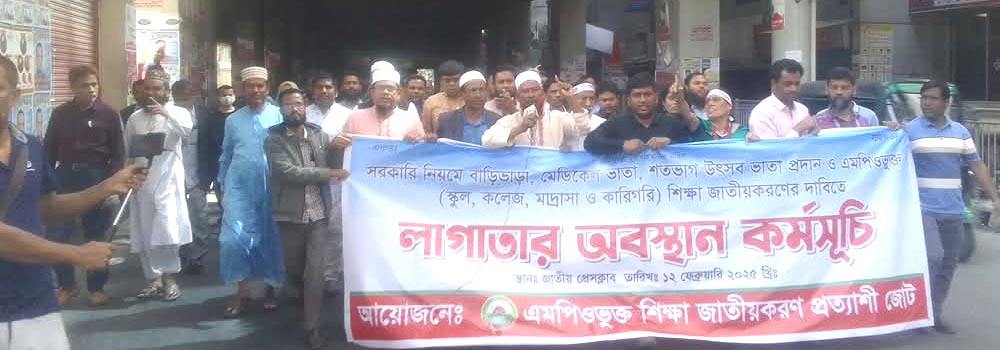 এমপিওভুক্ত শিক্ষায় বৈষম্য নিরসনসহ জাতীয়করণের দাবিতে জাতীয় প্রেসক্লাবের সামনে এমপিওভুক্ত শিক্ষক—কর্মচারিদের লাগাতার অবস্থান কর্মসূচির তৃতীয় দিনে দেশের বিভিন্ন প্রান্ত থেকে শত শত শিক্ষক—কর্মচারী অংশগ্রহণ করেন। শিক্ষক—কর্মচারিগণ সরকারি নিয়মে বাড়িভাড়া, চিকিৎসা ভাতা, শতভাগ উৎসব ভাতা ও সর্বজনীন (প্রতিষ্ঠান প্রধান থেকে কর্মচারী পর্যন্ত) বদলীর দাবি জানান। জোটের সদস্য সচিব ও বাংলাদেশ মাদ্রাসা শিক্ষক—কর্মচারী ফোরাম এর সভাপতি প্রিন্সিপাল দেলাওয়ার হোসেন আজীজী বলেন, মাননীয় শিক্ষা উপদেষ্টা আমাদের ভাতাসমূহ পরিবর্তনের মৌখিক আশ্বাস দিয়েছেন। কিন্তু এমপিওভুক্ত শিক্ষক—কর্মচারিগণ বারবার প্রতারিত হয়ে আশ্বাসের উপর বিশ্বাস করে আবারও প্রতারিত হতে চায় না। ১৫ ফেব্রুয়ারি শনিবারের মধ্যে শতভাগ উৎসব ভাতার প্রজ্ঞাপন জারি এবং বাড়িভাড়া ও চিকিৎসা ভাতা বৃদ্ধির ব্যাপারে সুস্পষ্ট ঘোষণা দেওয়া না হলে জাতীয় প্রেসক্লাবের সামনে লাগাতার অবস্থান কর্মসূচির পাশাপাশি ১৬ ফেব্রুয়ারি রবিবার এমপিওভুক্ত (স্কুল, কলেজ, মাদ্রাসা ও করিগরি) সকল শিক্ষা প্রতিষ্ঠানে অর্ধদিবস কর্মবিরতি পালন করা হবে। তিনি কর্মবিরতি পালনের ব্যাপারে প্রতিষ্ঠান প্রধান, শিক্ষক—কর্মচারী, শিক্ষার্থী ও অভিভাবকসহ সকলের সহযোগিতা প্রত্যাশা করেন। প্রেসক্লাবের সামনে অবস্থানরত শিক্ষক—কর্মচারীরা আজ দুপুর ১২ ঘটিকায় জাতীয়করণের দাবিতে এক মিছিল বের করেন। মিছিলটি প্রেসক্লাব থেকে শুরু হয়ে শিক্ষা ভবন ও পল্টন মোড় হয়ে আবার প্রেসক্লাবে এসে শেষ হয়। উল্লেখ্য যে, এমপিওভুক্ত শিক্ষক—কর্মচারিগণ মাসিক ১০০০/— বাড়ি ভাড়া, ৫০০/— চিকিৎসা ভাতা ও ২৫% উৎসব ভাতা পেয়ে থাকেন যা অত্যন্ত অযৌক্তিক ও অমানবিক। উপস্থিত সদস্যদের মধ্য থেকে বক্তব্য রাখেন জোটের সমন্বয়কারী জহিরুল ইসলাম, যুগ্ম আহবায়ক মোঃ শাহ আলম, আবু তালেব সোহাগ, জাহাঙ্গীর হোসেন, যুগ্ম সদস্য সচিব আবুল বাসার, মো. মনিরুল ইসলাম, আব্দুল হাই সিদ্দিকী, রবিউল ইসলাম, তোফায়েল সরকার, সবুজ হাসান, আমাতুন্নাহার, ফররুখ শেরাহ্, মো. কাইয়ুম, আফরোজা শ্রাবন, অধ্যক্ষ আলা উদ্দিন, অধ্যক্ষ হারুন অর রশীদ, আব্দুর রহমান, অধ্যক্ষ হাবিবুর রহমান, অধ্যক্ষ ইসমাইল হোসেন, অধ্যক্ষ মফিজুল ইসলাম, অধ্যক্ষ আবু সায়েম মোল্লা, উপাধ্যক্ষ নুরুল আলম খান, অধ্যক্ষ রুহুল আমীন, গোলাম সাদেক, মো. ইলিয়াস, নূরুল আলম হেলালী ও আঃ হালিম প্রমুখ।