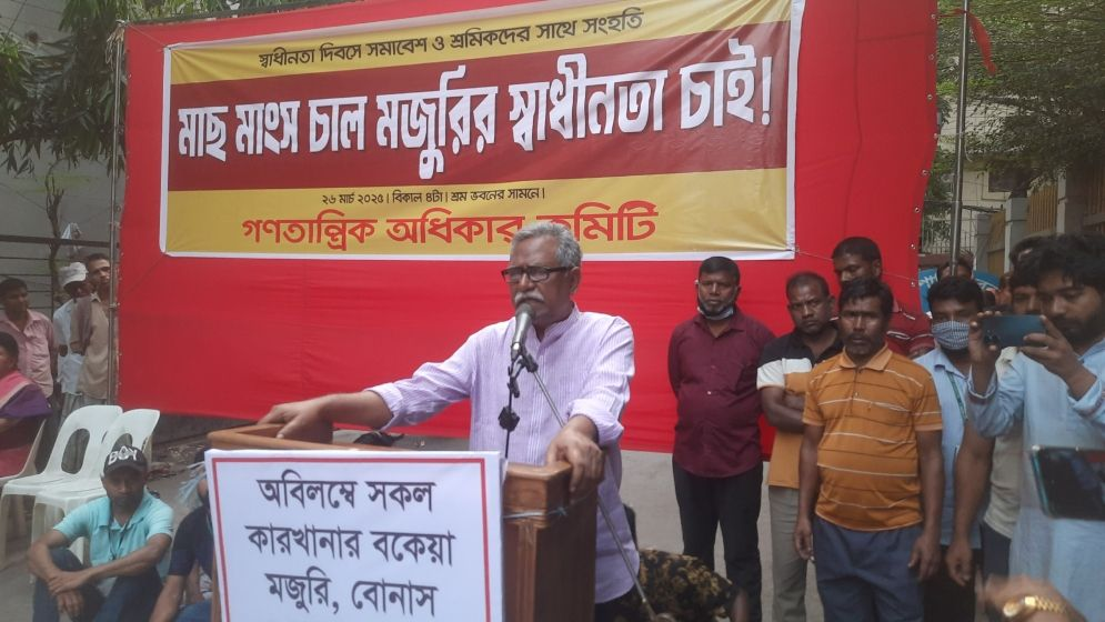 বুধবার বিকেলে রাজধানীর বিজয়নগরের শ্রম ভবনের সামনে ‘মাছ মাংস চাল মজুরির স্বাধীনতা চাই’ শীর্ষক সমাবেশে সভাপতির বক্তৃতায় তিনি এই মন্তব্য করেন। স্বাধীনতা দিবসের প্রাক্কালে শ্রমিকদের প্রতি সংহতি জানিয়ে গণতান্ত্রিক অধিকার কমিটি এ সমাবেশের আয়োজন করে।