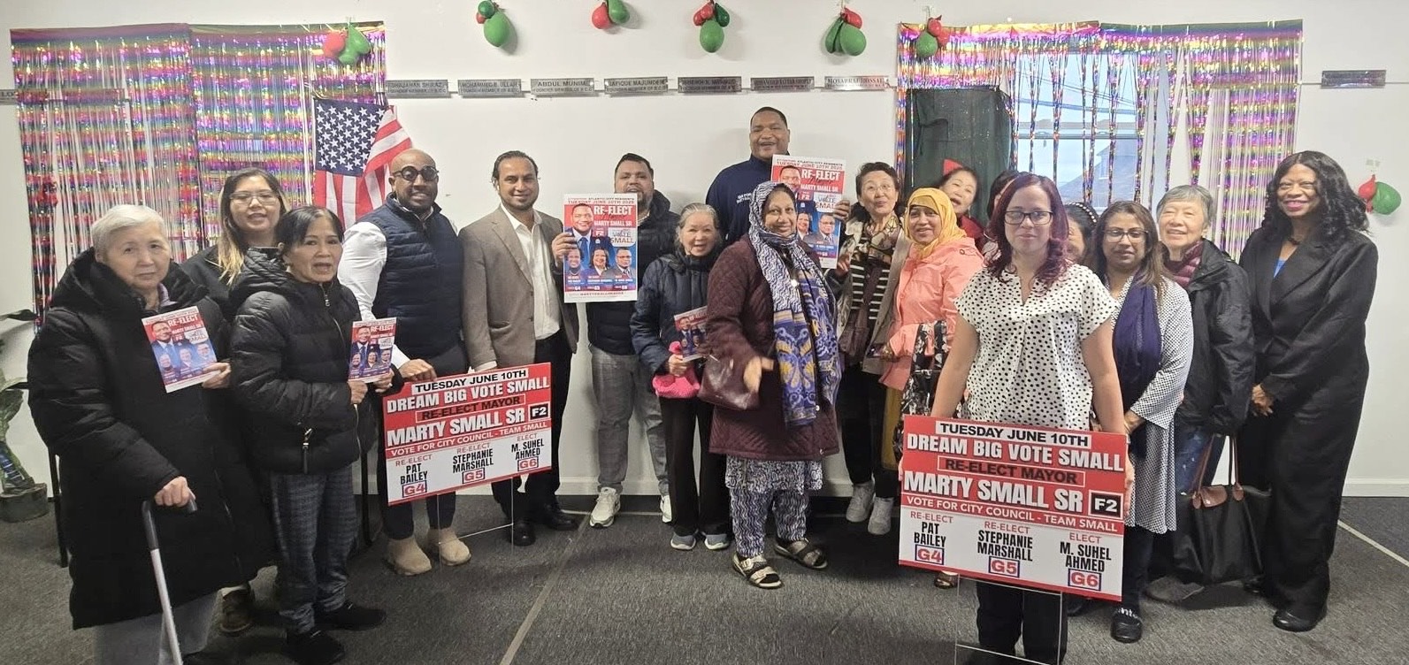 মহিলা সমাবেশে প্রধান অতিথির বক্তব্যে মেয়র মার্টি স্মল আগামী দশ জুন, মঙ্গলবার অনুষ্ঠেয় প্রাইমারি নির্বাচনে উন্নয়নের ধারা অব্যাহত রাখার লক্ষ্যে মেয়র পদে তাঁকে ও তাঁর প্যানেলে কাউন্সিল এট লার্জ প্রার্থী স্টিফেনি মার্শাল, প্যটিসিয়া বেইলি ও সোহেল আহমেদকে ভোট দিয়ে জয়যুক্ত করার জন্য আহ্বান জানান ।