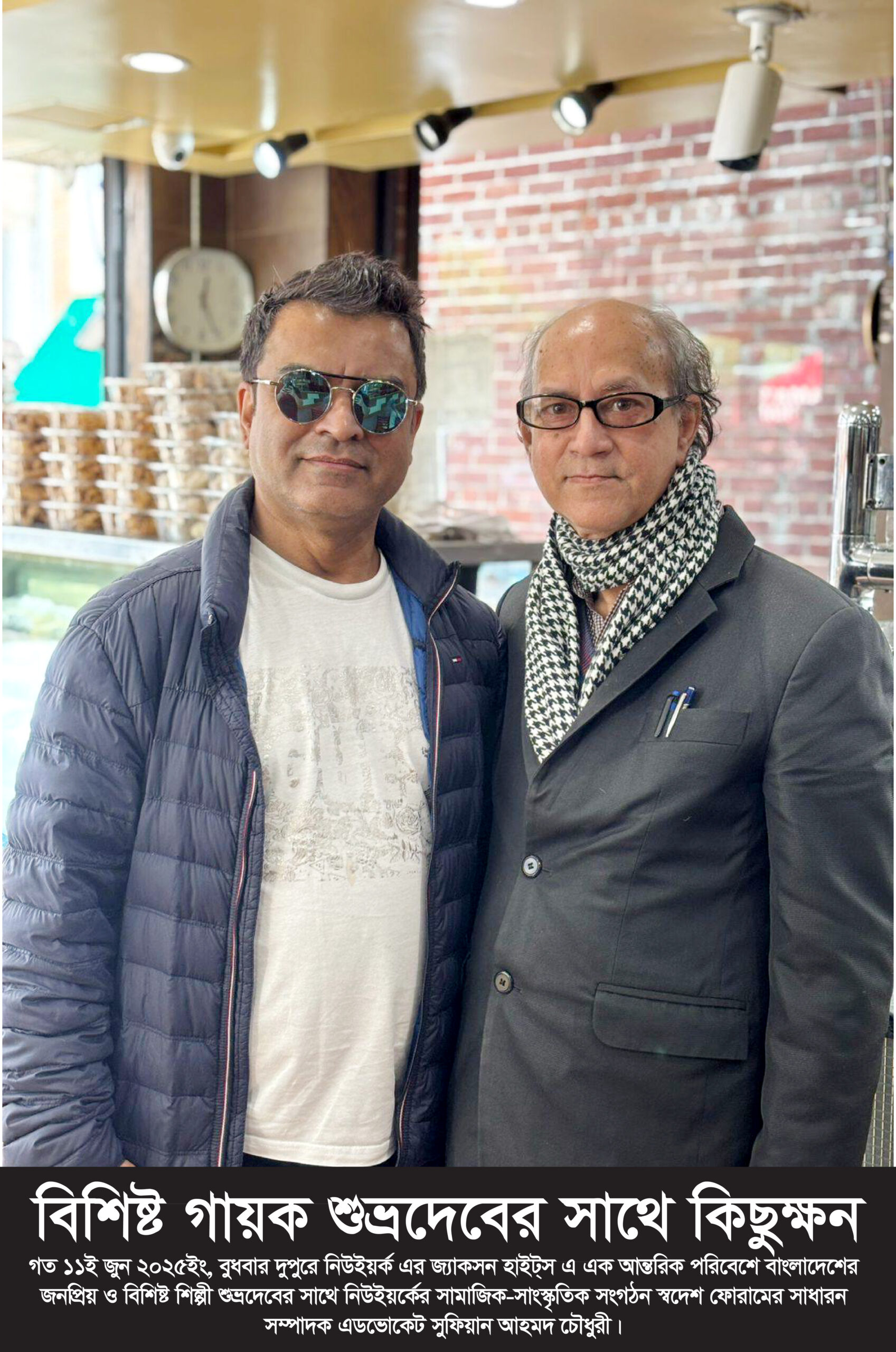 গত ১১ই জুন ২০২৫ইং, বুধবার দুপুরে নিউইয়র্ক এর জ্যাকসন হাইট্স এ এক আন্তরিক পরিবেশে বাংলাদেশের জনপ্রিয় ও বিশিষ্ট শিল্পী শুভ্রদেবের সাথে নিউইয়র্কের সামাজিক-সাংস্কৃতিক সংগঠন স্বদেশ ফোরামের সাধারন সম্পাদক এডভোকেট সুফিয়ান আহমদ চৌধুরী।