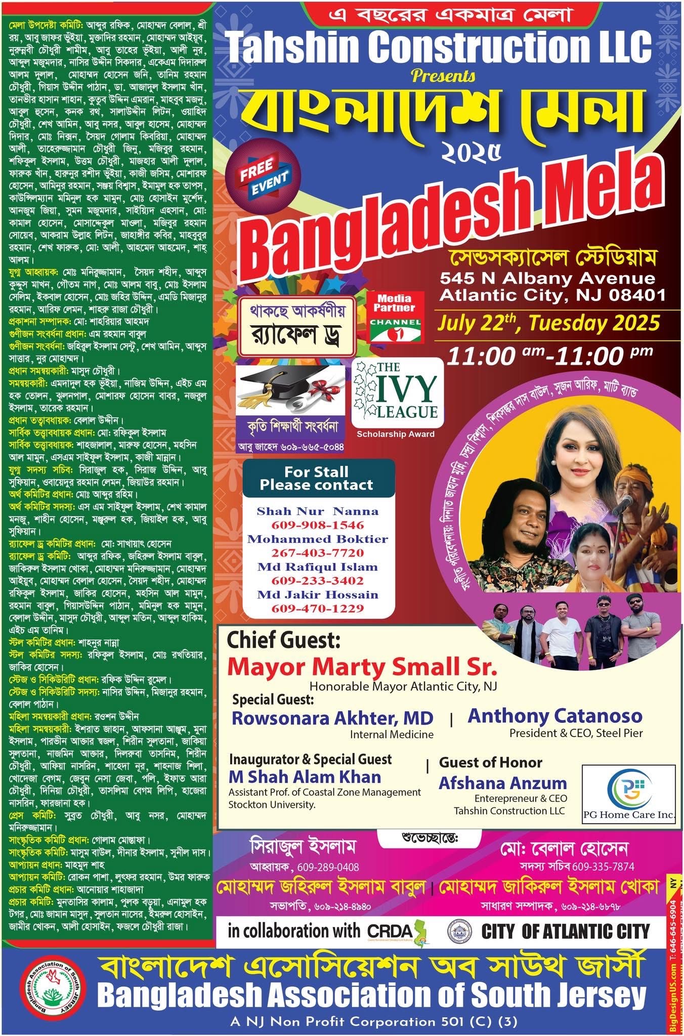 এবছর আটলান্টিক সিটিতে ‘বাংলাদেশ মেলা’ অনুষ্ঠিত হতে যাচ্ছে আগামী ২২ জুলাই, ২০২৫, মঙ্গলবার।প্রবাসী বাংলাদেশিদের প্রাণপ্রিয় সংগঠন বাংলাদেশ এসোসিয়েশন অব সাউথ জার্সি (বিএএসজে)র উদ্যোগে ওইদিন আটলান্টিক সিটির সেন্ডসক্যাসেল স্টেডিয়াম এর উন্মুক্ত প্রাঙ্গণে সকাল এগারোটা থেকে শুরু হয়ে রাত এগারোটা পর্যন্ত চলবে ‘বাংলাদেশ মেলা’র কার্যক্রম।আটলান্টিক সিটিতে এবছর একটি মেলা অনুষ্ঠিত হবে ।