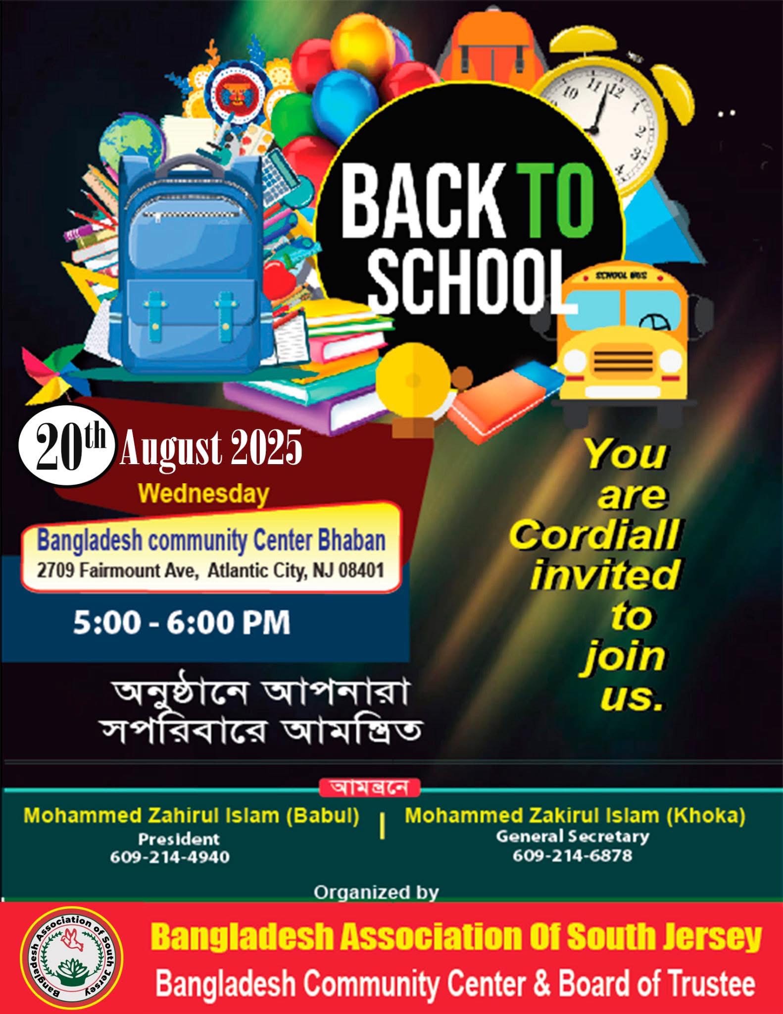 আগামী ২০ আগষ্ট, বুধবার বিকেল পাঁচটায় আটলান্টিক সিটির ২৭০৯, ফেয়ারমাউণ্ট এভিনিউতে অবস্থিত ‘বাংলাদেশ কমিউনিটি সেন্টার’এ (আগে আসলে আগে পাবেন ভিত্তিতে) ছাত্র-ছাত্রীদের মাঝে বিনামূল্যে স্কুল ব্যাগ সহ স্কুল সামগ্রী বিতরণ করা হবে।