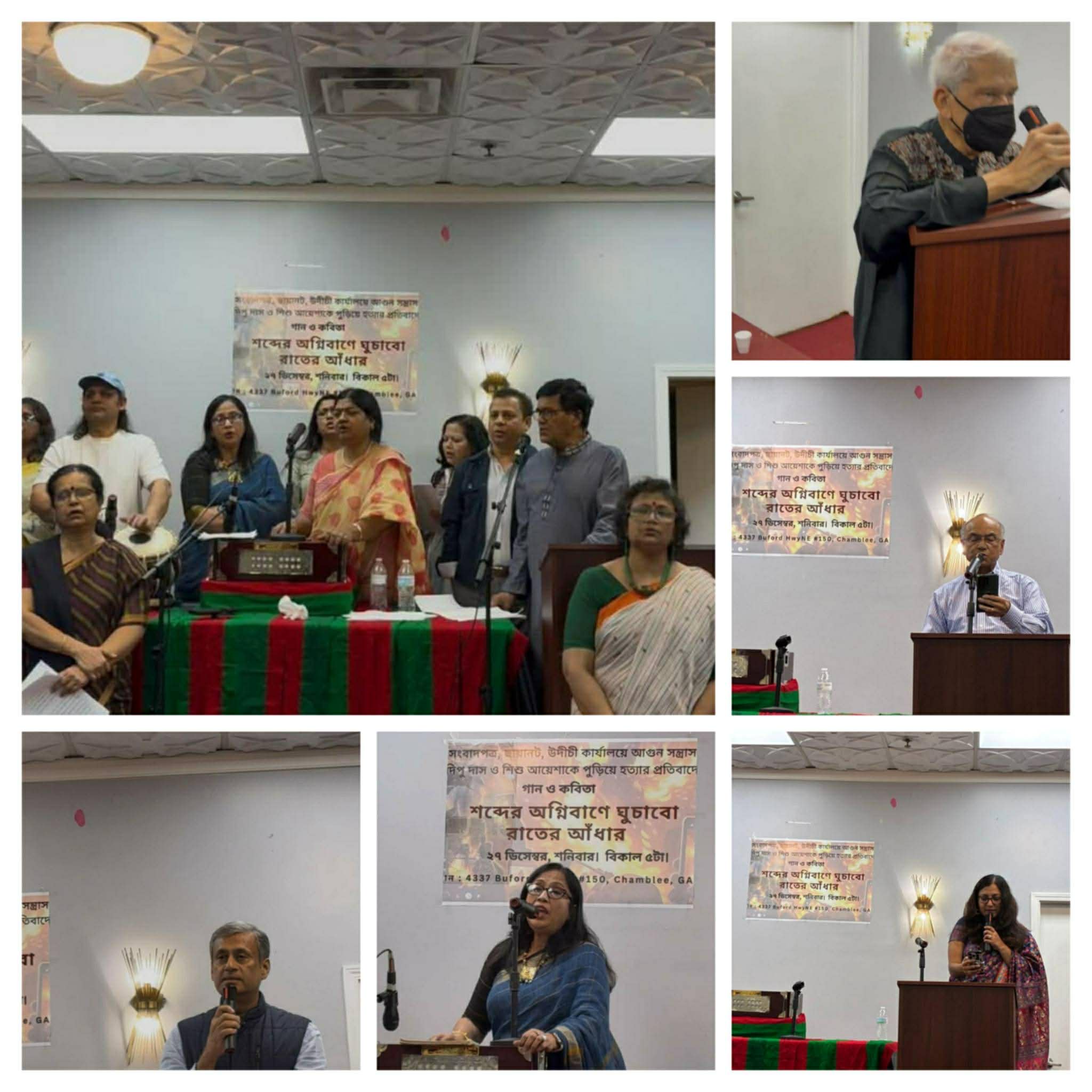 মানবতার জয় হোক !! এই বিশ্বাসে গত ২৭ ডিসেম্বর ২০২৫ জর্জিয়ার ডোরাভিল সিটির বিওফোর্ড হাইওয়ের দেশি স্ট্রিট রেষ্টুরেন্টে সম্প্রতি বাংলাদেশে সংবাদপত্র,ছায়ানট ও উদীচীর কার্য্যালয়ে আগুন সন্ত্রাস দিপু দাস ও শিশু আয়শাকে পুড়িয়ে হত্যা করার প্রতিবাদে আয়োজিত হলো গান ও কবিতার মাধ্যমে প্রতিবাদ অনুষ্ঠান “শব্দের অগ্নিবানে ঘুচাবো রাতের আঁধার” আলোচনা ও গান – কবিতায় উঠে এসেছে মানুষ ও মানবতার কথা / তুমি হিন্দু মারো, তুমি মুসলমান মারো, তুমি শিশু হত্যা করো, তুমি সংবাদপত্র পুড়িয়ে দাও এই সব কিছুই দেশ ও জাতির শত্রু। ধর্মীয় মৌলবাদ স্বাধীনতা, জাতি-ধর্মের সম্প্রীতির জন্য কখনোই অনুকূল যে নয় বাংলাদেশের সাম্প্রতিক ঘটনাগুলোই তার প্রমান। কবি ও আবৃত্তি কর্মী রাশেদ চৌধুরীর উপস্থাপনায় কেন ও কি কারণে আজকের এই আয়োজন তা নিয়ে আলোচনা করেন কবি উৎপল দত্ত। প্রতিবাদী আলোচনা,কবিতা পাঠ ও আবৃত্তি করেন মুক্তিযোদ্ধা কবি শেলী শাহাবুদ্দিন, মীর মজিবুর রহমান, নাসির আহমেদ,পঙ্কজ দাস,জয়িতা চক্রবর্তী, রিপন দাস, ইলা চন্দ, আদ্রিকা চৌধুরী, সোহানা তুলি, মিত্র বণিক, দিলু মাওলা, স্বপন মন্ডল, কাকলি বিশেষ, উৎপল দত্ত। গানে অংশ নেন উদীচী শিল্পী গোষ্ঠী জর্জিয়া শাখার শিল্পীবৃন্দ। একক গান করেন গোলাম মহিউদ্দিন, রুবিনা শম্পা, শক্তি রায়, অশোক সরকার, হোসনে আরা বিন্দু, স্নিগ্ধা দত্ত ও মোহাম্মদ আদিল। নতুন প্রজন্মের তরুণ দীপ চৌধুরী বর্তমান সময়কে তুলে ধরে তার অনুভূতির কথা ব্যক্ত করেন।
